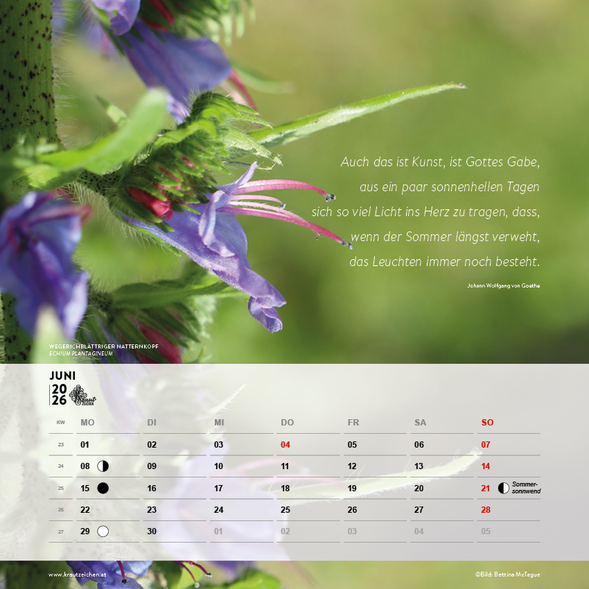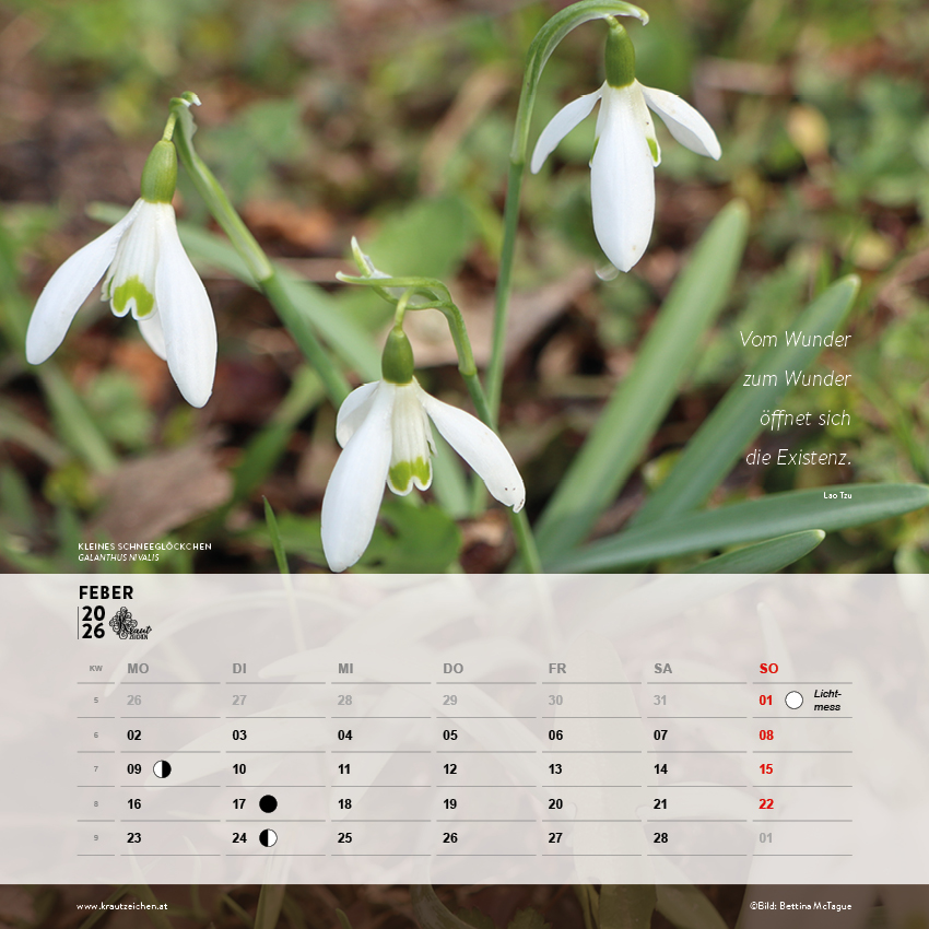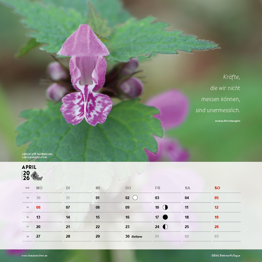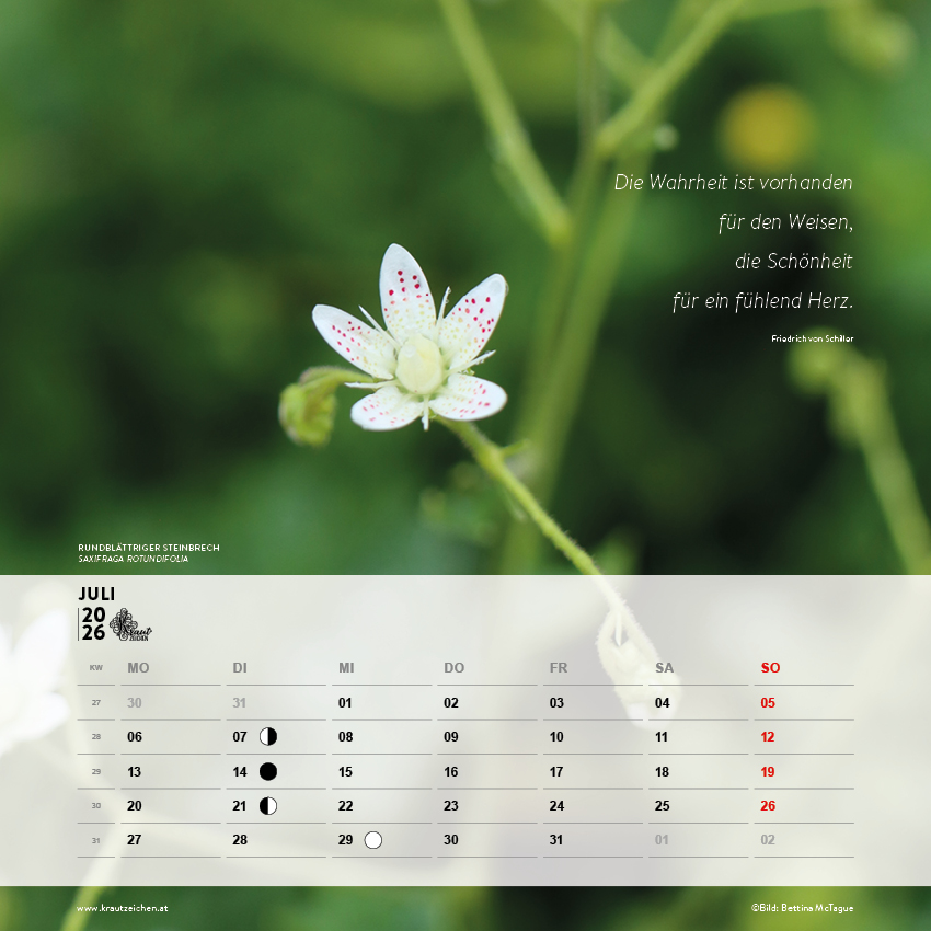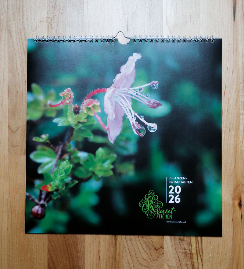 Lass Dich mit unserem KrautZeichen Wandkalender inspirieren. Zwölf wunderschöne Großaufnahmen von heimischen Pflanzen begleiten Dich mit ihrer Botschaft durch das Jahr 2026. Übersichtlich zeigt dieser Fotokalender auch die jeweiligen Mondphasen und Jahreskreisfeste.