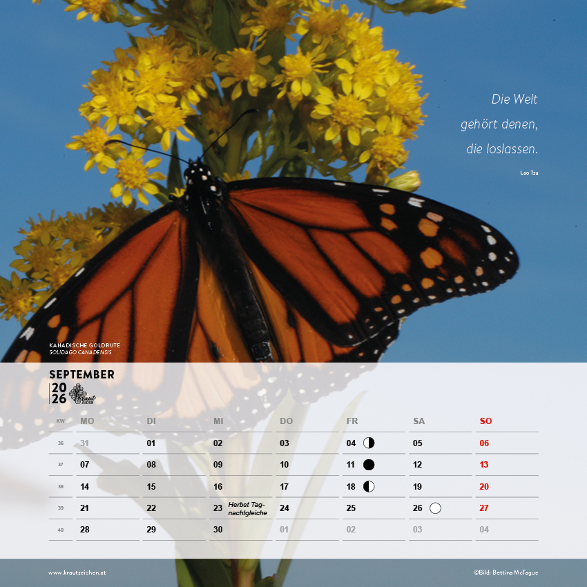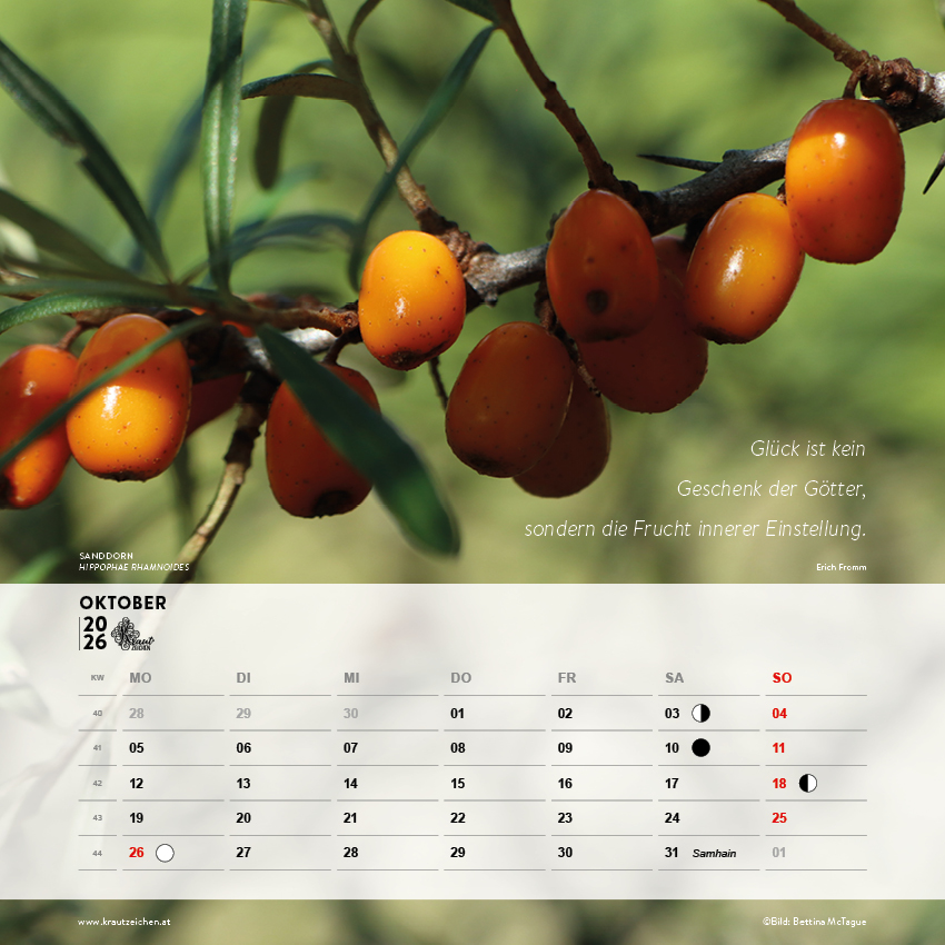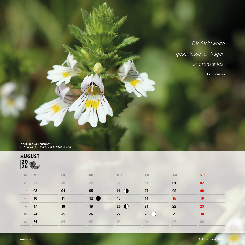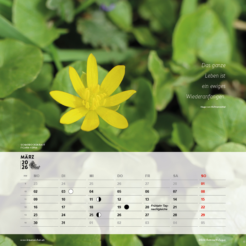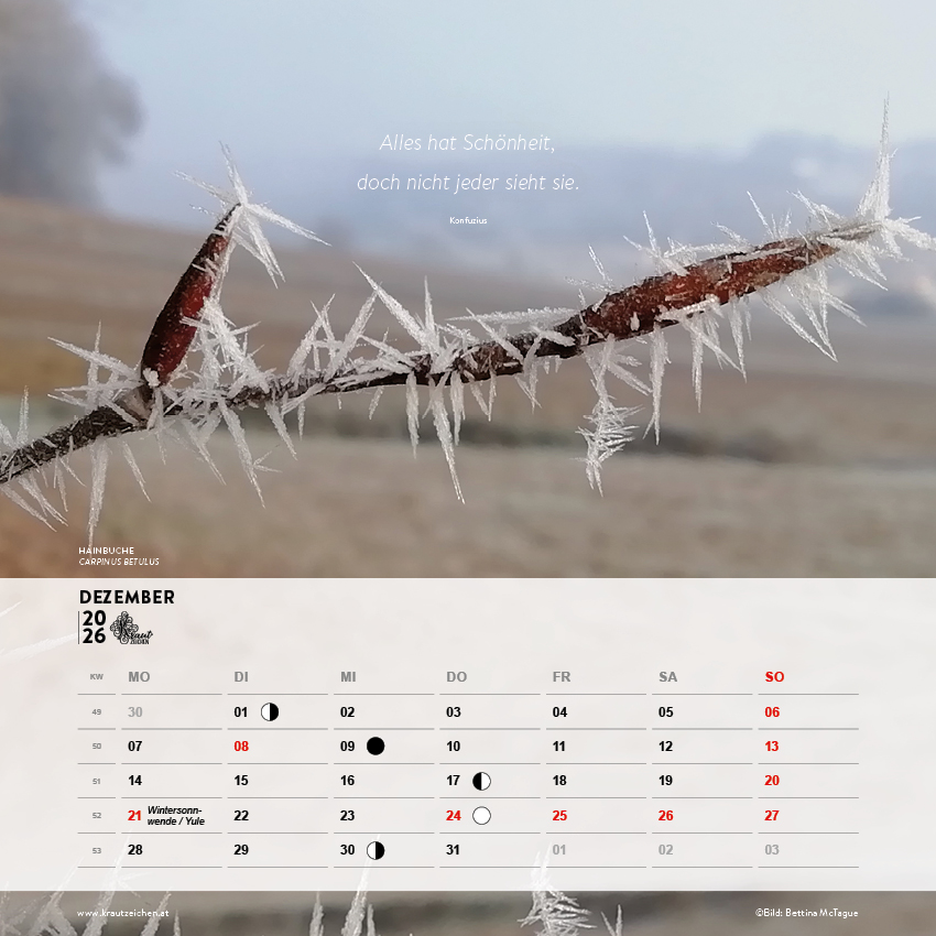 Lass Dich mit unserem KrautZeichen Wandkalender inspirieren. Zwölf wunderschöne Großaufnahmen von heimischen Pflanzen begleiten Dich mit ihrer Botschaft durch das Jahr 2026. Übersichtlich zeigt dieser Fotokalender auch die jeweiligen Mondphasen und Jahreskreisfeste.